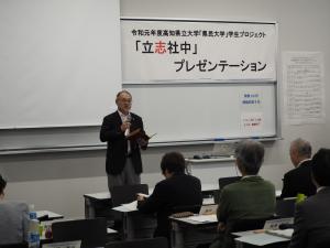 「立志社中」とは、地域の課題解決に向けて地域の方と協働して主体的に取り組む学生の活動に対し、大学がその活動資金等の支援を行うもので、今年度は、8件(学生総勢323名)の応募があり、学生たちはそれぞれの思いを胸に、立志社中の採択を目指して、野嶋学長、審査委員、学生・教職員約85名の前でプレゼンテーションを行いました。