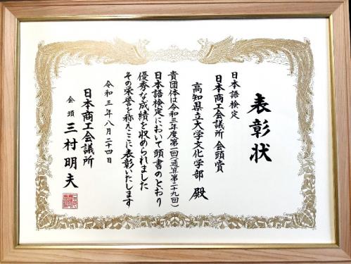 この度、文化学部は、令和3年度第1回の日本語検定(2級・3級)において全国でも非常に優秀な成績を収め、日本語検定委員会より団体表彰「日本商工会議所 会頭賞」を受賞いたしました。
