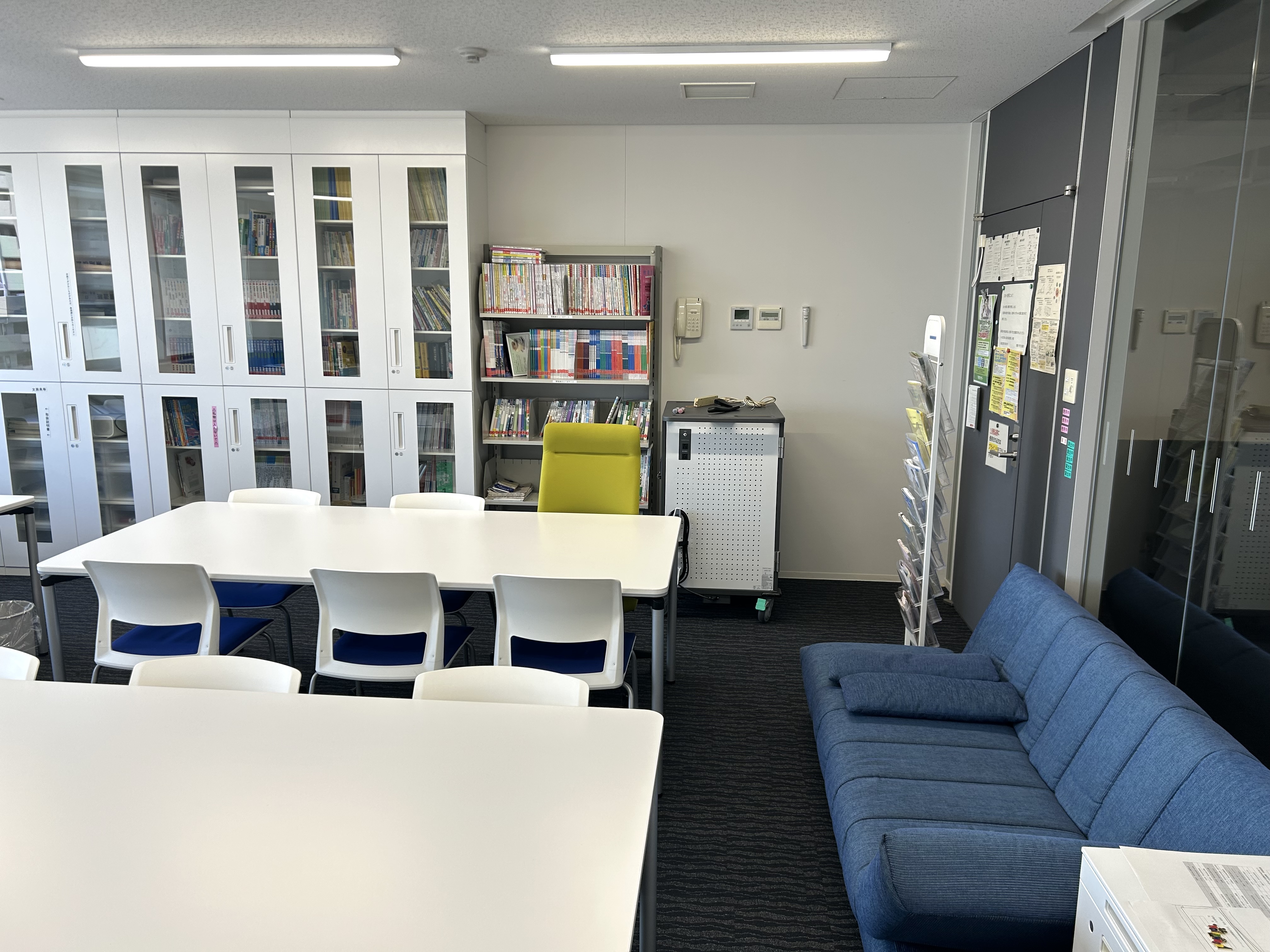 教育研究棟5階にある学生・教員の談話用の空間です。自習スペースにもなっています。申請不要で自由に利用可能です。