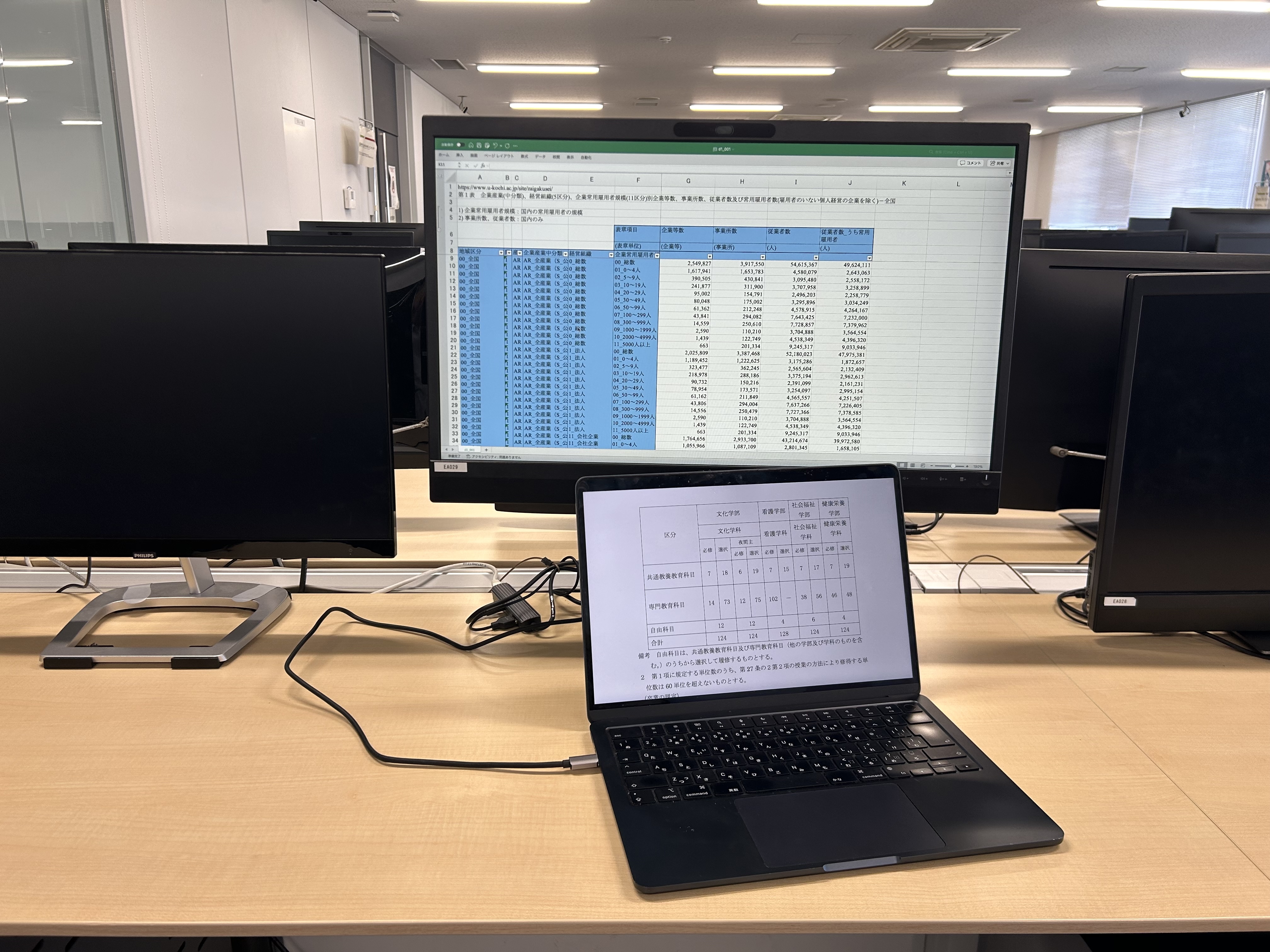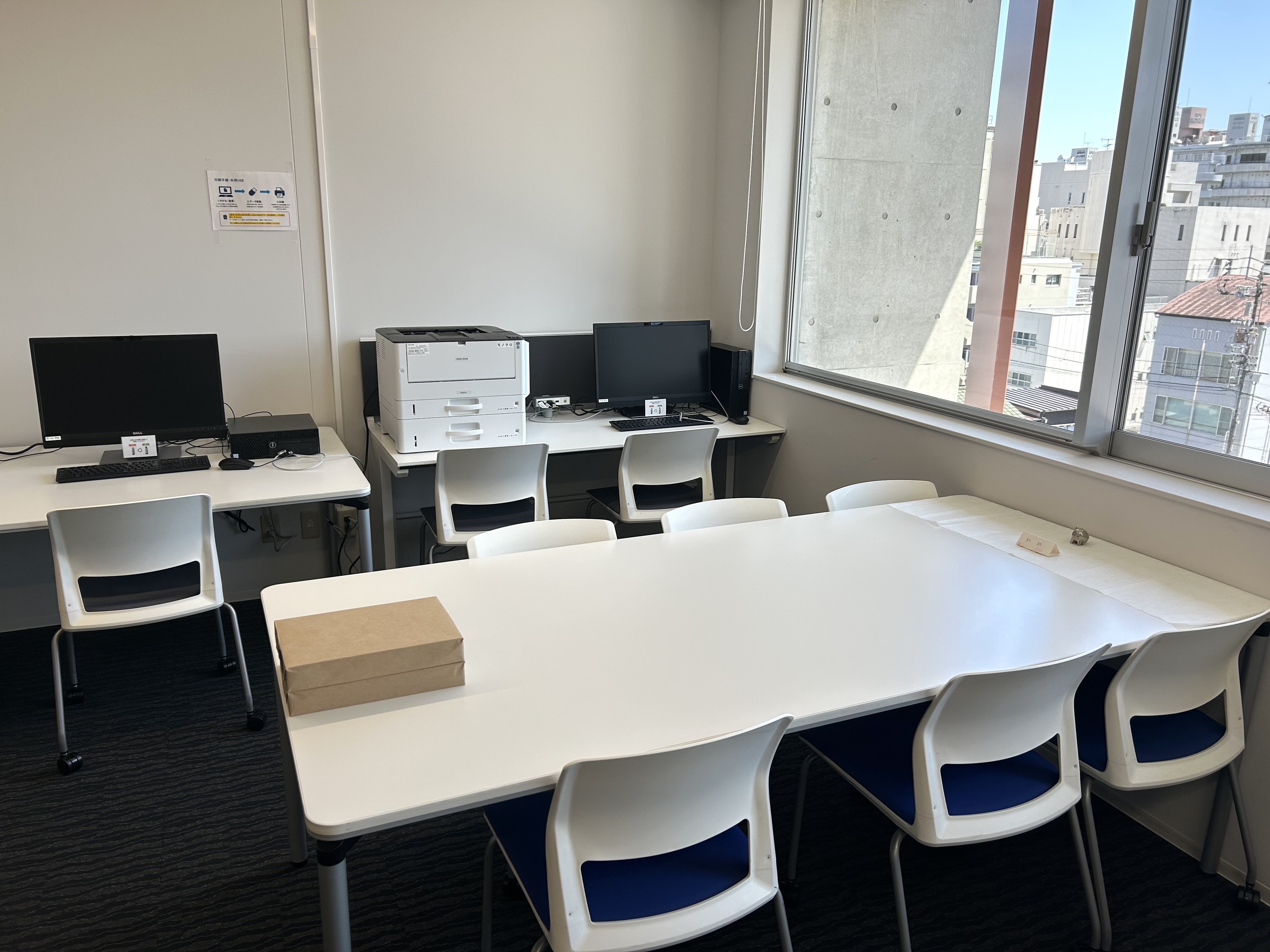 教育研究棟2階に、持参したPCを外部ディスプレイに接続して作業できる部屋があります。USB-Cケーブルに接続すると、給電、有線ネットワークも同時に提供されます。講義で使用されている時間帯以外は自由に利用可能です。