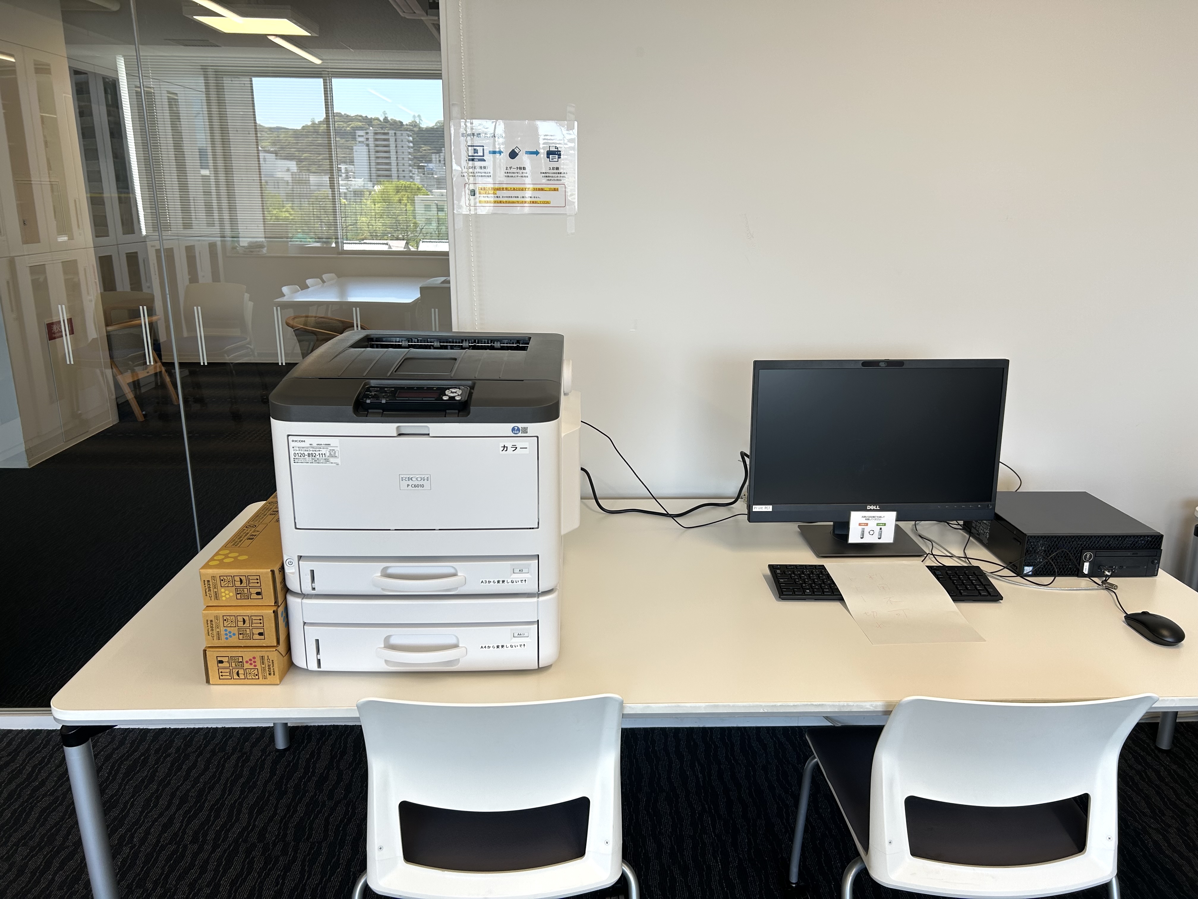 教育研究棟4階に、学生が持参した電子データを紙媒体に変換・出力できる設備があります。モノクロ印刷、カラー印刷が可能です。