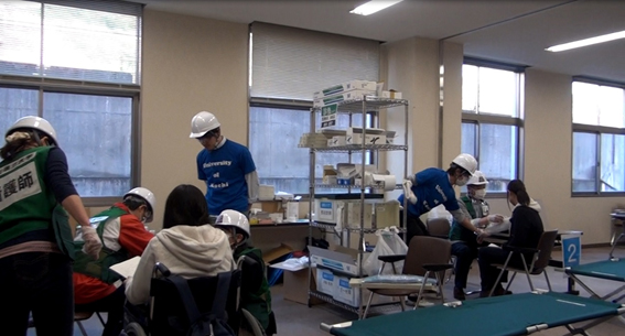 本年度も、高知県立大学では、実際に被災した状況を考慮して、受傷者・避難者誘導チーム、軽症者受け入れチーム、避難住民支援チーム、食料等対応チーム、そして災害対策本部を立ち上げ、訓練を行いました。