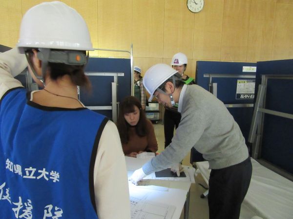 避難住民支援チームでは、避難所となる体育館での避難者受け入れだけではなく、今回から初めて避難者の方々に、事前に認知症などの心理社会的に困難な状況を設定し、避難所でのトリアージを実施し、それらに対応できる訓練をしました。また、避難所運営上の課題、あるいは池地域の災害に関する課題の整理と対応に関して、地域住民の皆さんと「立志社中」の「いけいけサロン活動」の学生も加わり、懇談会を実施しました。